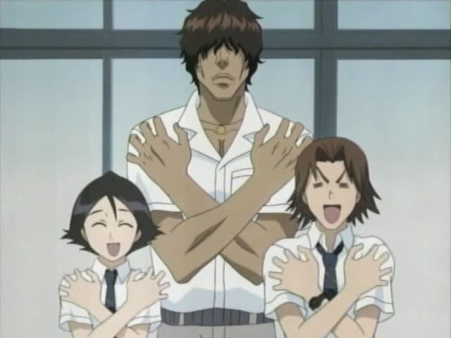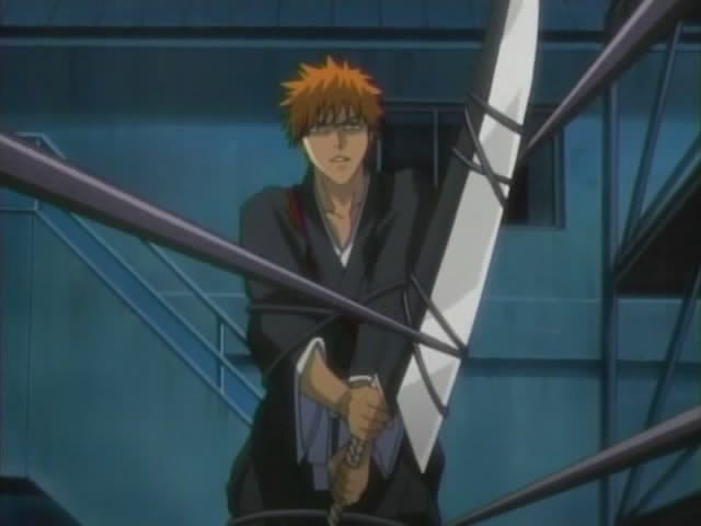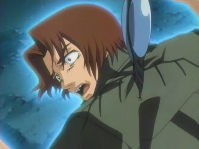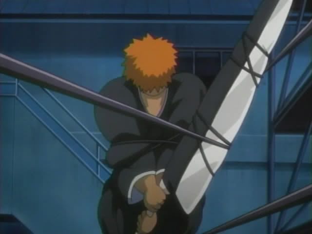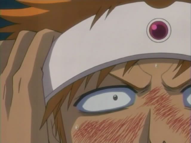 So anyway... Jinta and Ururu arrive in front of Ichigo to delver the new Bount sensor that Urahara made... and because Urahara likes messing with Ichigo the sensor was attached to something that Ichigo is quite familiar with: THE HEADBAND OF JUSTICE! (He really yelled out the thing Urahara told him. Wolfina would be proud.) The sensor picks up Bount activity immediately and literally drags Ichiygo toward it (and into a fence.)