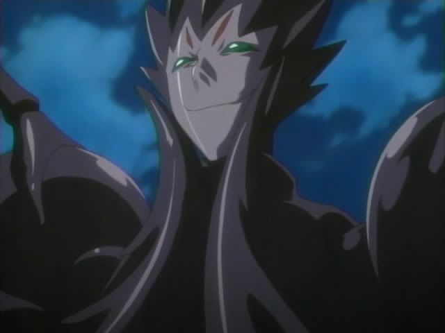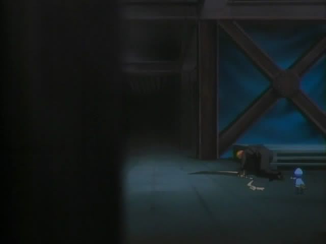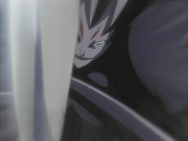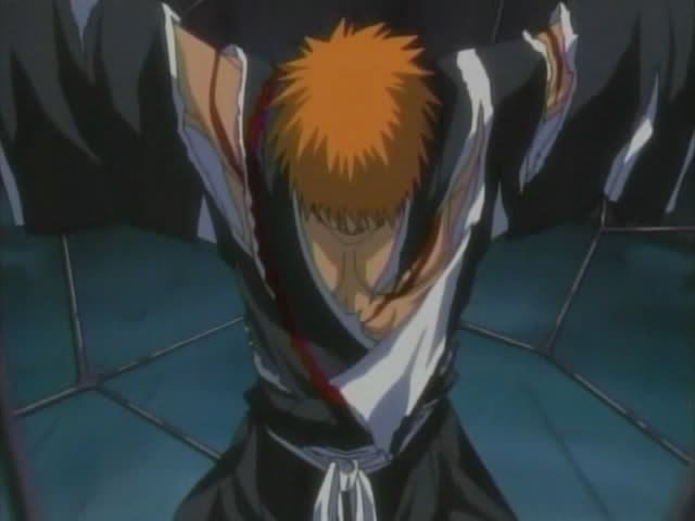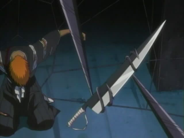 Back to the construction site... Ichigo managed to get out of the iron ropes. (I think the ballooning up thing might have been Ririn's illusion powers.) Ririn wants Ichigo to run away, but Ichigo won't leave Keigo. Koga and his doll have followed them inside the building and the dolls makes an iron web. She catches Ichigo in it and whips him until he bleeds and seems to lose consciousness. She then takes Zangetsu and charges to toward Ichigo.. ready to run him through with his own sword. But just before she gets to him Ichigo stops the blade with his bare hand. (The screen did the letterbox thing where the black bars slowly close over Ichigo.) Ichigo easily takes Zangetsu back and Hollow!Ichigo appears!. He has no trouble handling the doll and slices her in half once again. Hollow!Ichigo begins laughing like crazy only to be interrupted by Ichigo who rips his mask off and falls to the ground. Koga comments that Ichigo's heart isn't strong enough to control his power and that someday Ichigo will destroy himself. Koga then reforms his doll to finish off Ichigo.