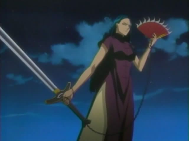 Meanwhile Renji has totally collapsed after killing the Bug dolls around him. Rukia and co. have lost their lead on him since his energy disappeared. Rukia, Jinta, and Ururu manage to find Orihime and Claude, but they can't find Renji either. Before they can form a plan Yoshi (the girl Bount) shows up and attacks them with her doll. (The sword and the fan talk for extra WTFness.) Rukia tells Ururu to go find Chad and Nova and sends Jinta to find Renji. Rukia sends one of her spells at Yoshi, but she easily dodges it. Yoshi throws her sword at Rukia, who avoids it, and then sends her fan toward her. Orihime blocks the fan with her shield and the three (Orihime, Rukia, and Claude) get ready to take on Yoshi.