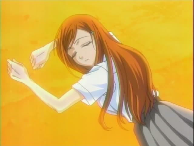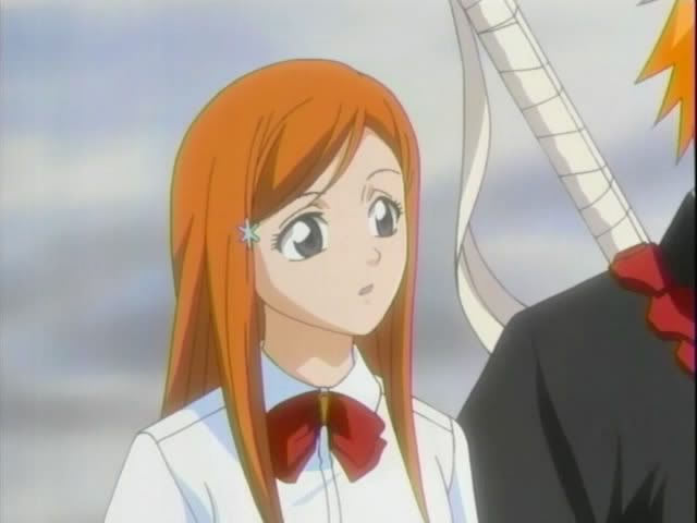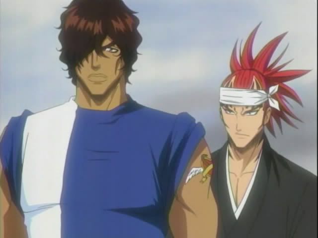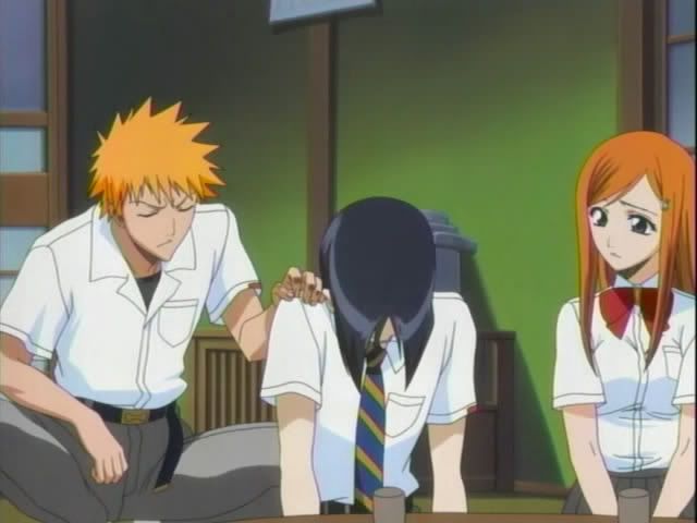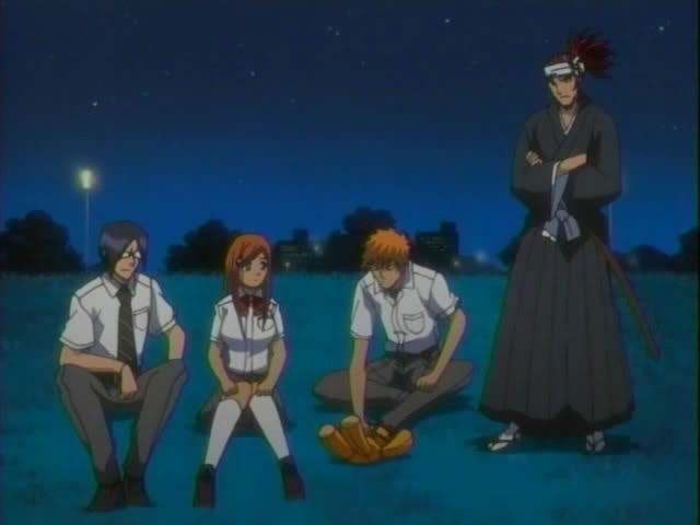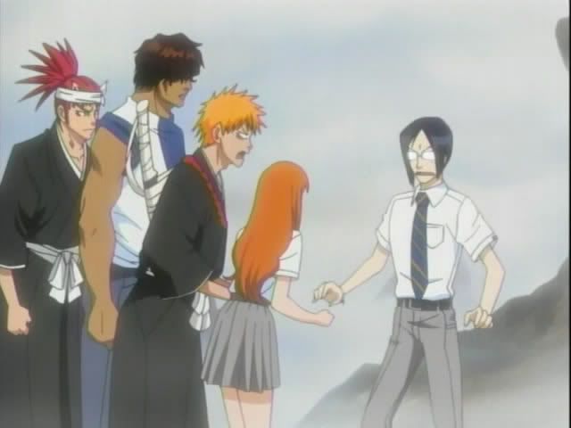We start with out with our guys having a pow-wow by the river. Renji is not happy. So he and Ichigo get into (another) fight. Ishida and Orihime try to calm them down. They talk some more (Orihime does her usual baffle everyone with Hime-logic) before the scene changes. (Oh and there's more Kon abuse.)