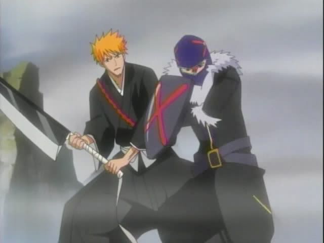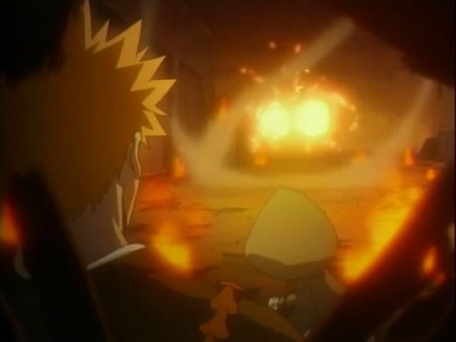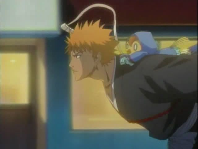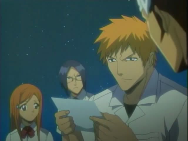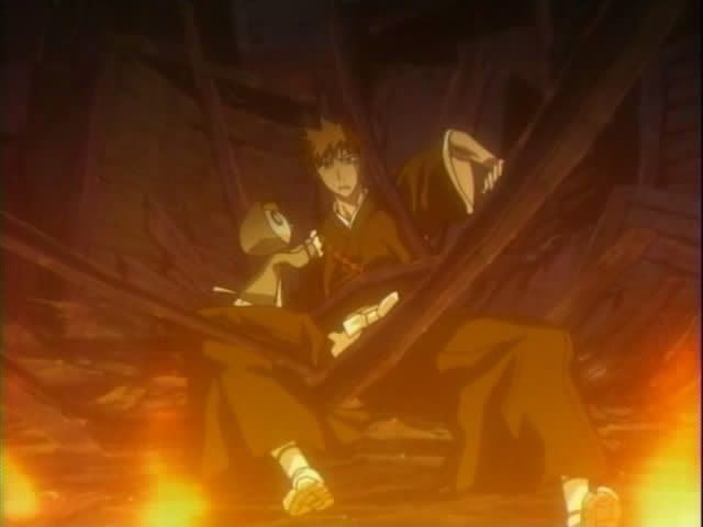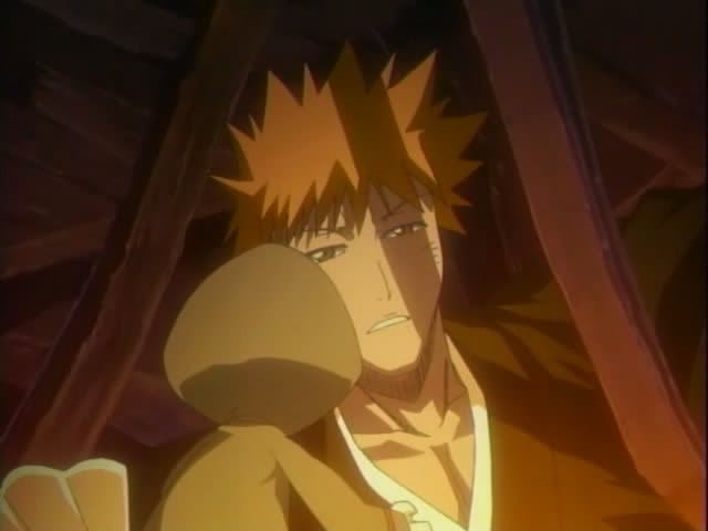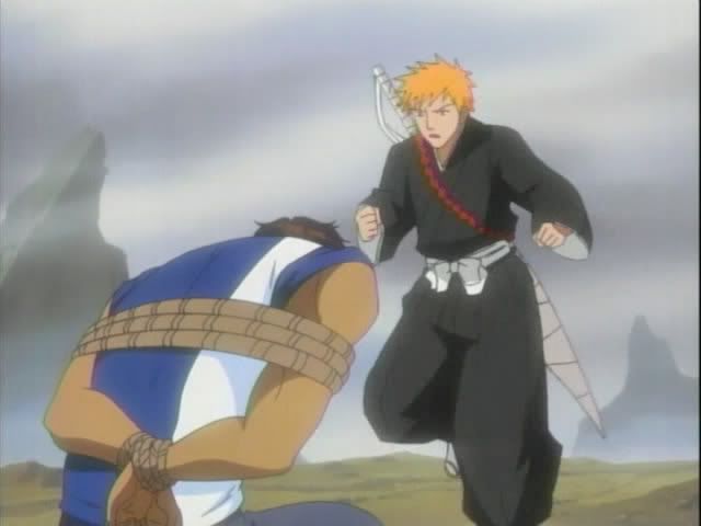 Ichigo rushes up the hill to check on Chad who is completely unharmed and easily breaks his bonds. Ichigo notices Urahara's hat on the ground nearby. And actually puts his brain to good use.