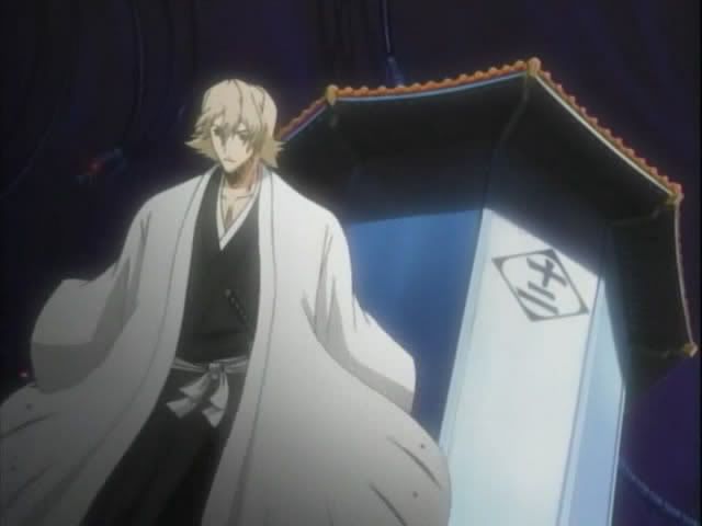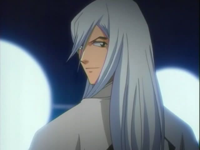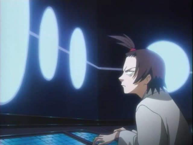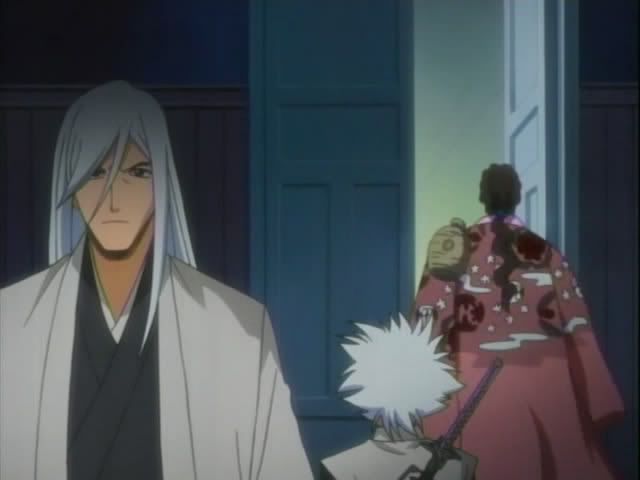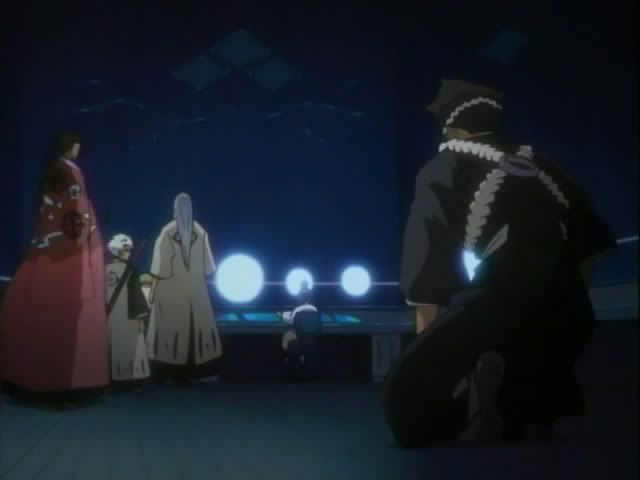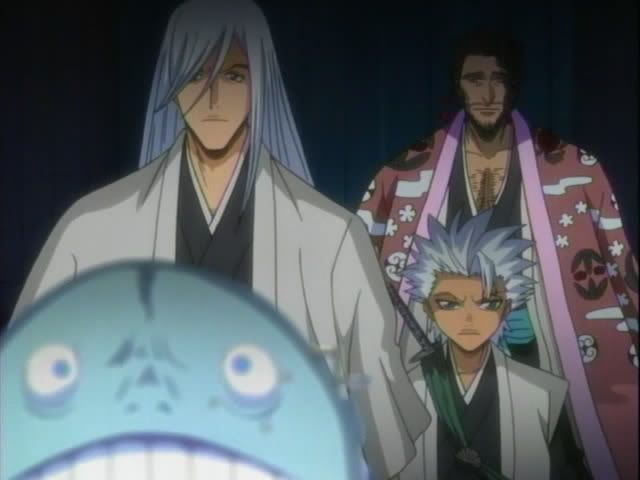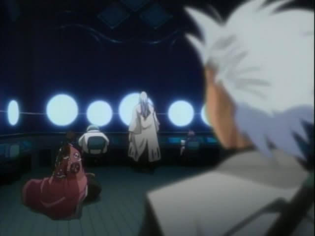 Back in Soul Society Hitsugaya heads to the 12th Division to check in on the goings on. He arrives at the monitoring room (I'm sure it has a better name) and finds Ukitake and Shunsui already there. Shunsui offers booze and Ukitake's hair is pretty. (Also.. yay for us getting to see these 12th Division guys! This is the first time we've actually seen them animated. No Akon though. *sad*) The 12th Division guys pick up on something.