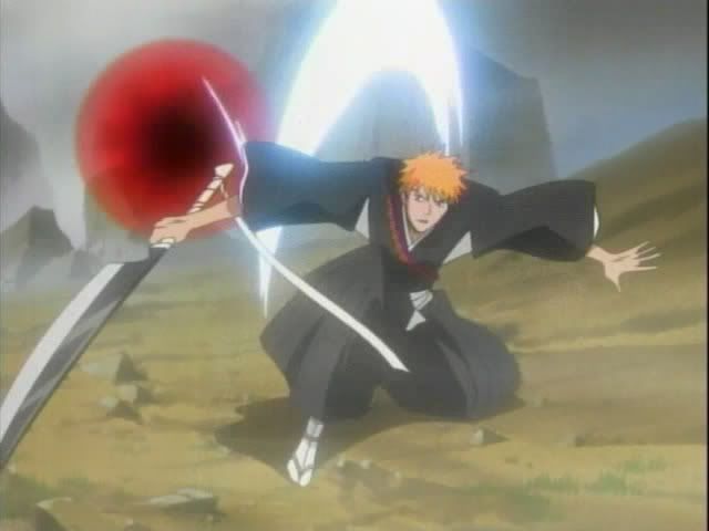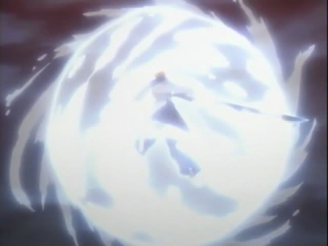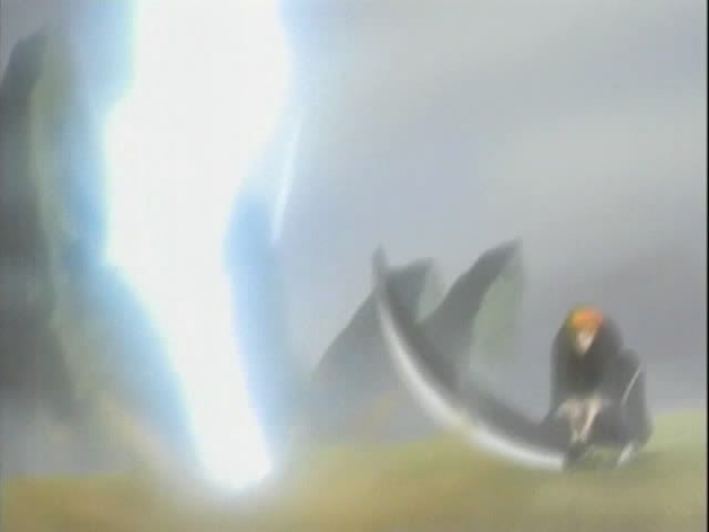 Meanwhile Ichigo and Claude are still fighting it out. Ichigo breaks out the big stuff which puts Claude into a brief panic. Nova (and his pretty eyes) notice and leaves Renji hanging. He warps himself to Claude and pulls the shield(?) off his back. He uses it to send Ichigo's attack back on himself. Ichigo dodges and it gets sent a nearby rock.