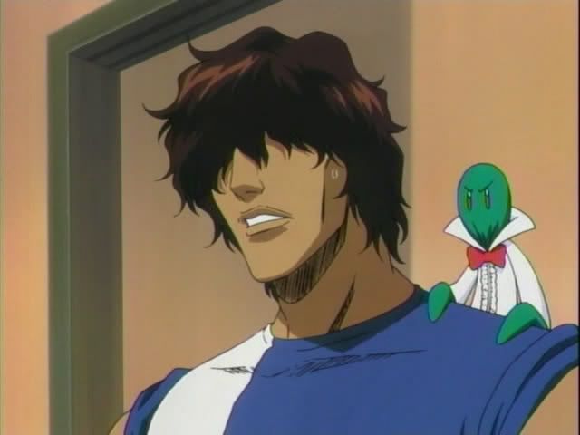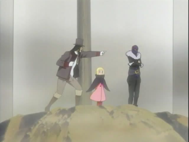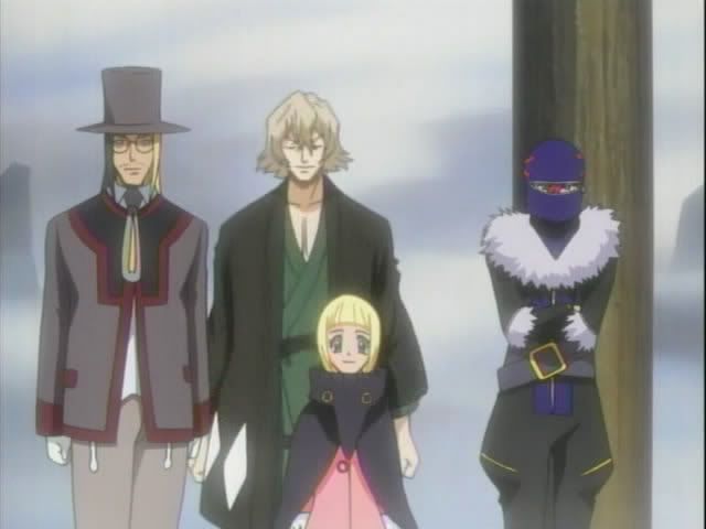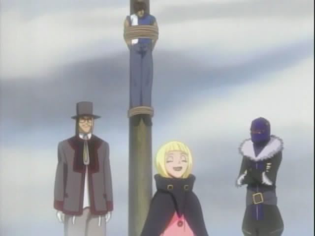 Orihime wakes up (on her shield) in a barren area and finds Kon and Ishida. Orihime runs past Kon to check on Ishida. Ichigo and Renji arrive soon after and they find The Mod Squad and their hostage. Ririn announces a challenge stage! Ichigo has five minutes to save Chad, who is totally having flashbacks to the end of Disney's Aladdin. But there's a little catch... he has to get past Claude and Nova. (By the way... Nova, and his sexy self, is a man of very few words, which is a shame considering he's voiced by Sugita Tomokazu. This seems to annoy Claude a bit and it actually reminds me of the way Keigo reacts to Chad's lack of speech.)