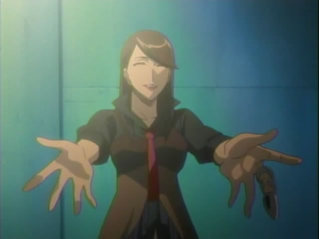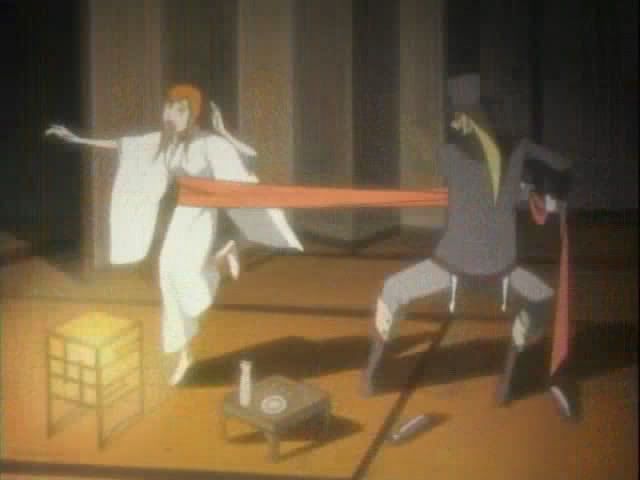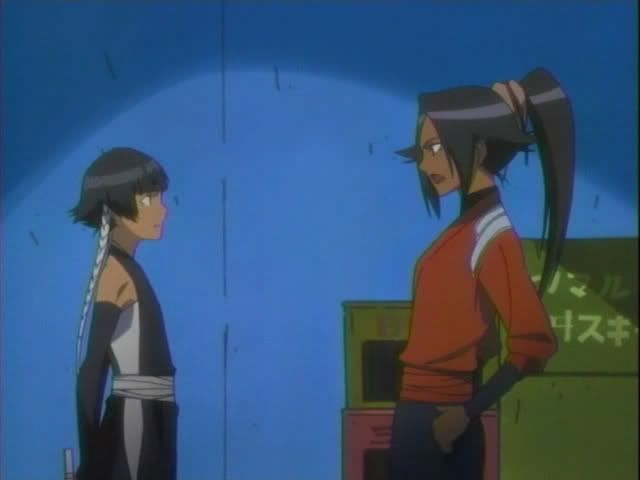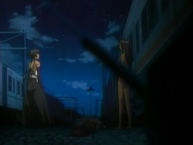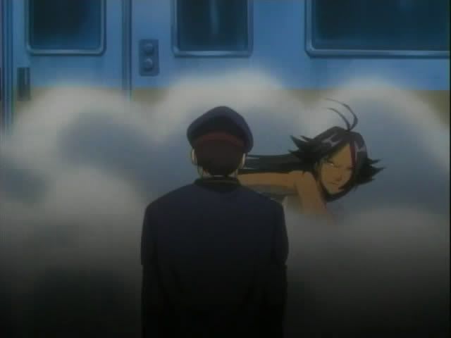 While that's going on Soi Fong and Yoruichi are still out investigating. They hear a woman singing and head toward the train yard. They find a man in a trance moving toward a mysterious woman, the singer. Just as the woman gets ready to go after the man Yoruichi hops on the roof the train car and changes into her human form. She leaps down on the woman which kicks up a huge amount of dirt. Back in Soul Society the monitors in the 12th Division put out static. The well placed dust helps hide Yoruichi as she attack the woman. The woman releases the man and jumps away. She trades words with Yoruichi before disappearing. A still naked Yoruichi sends Soi Fong away (back to Ukitake I think.) In Soul Society Ukitake summons Kotsubaki and gives him an order. Shunsui takes his booze and heads out while Hitsugaya and Ukitake stay on the case.