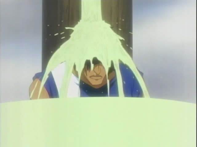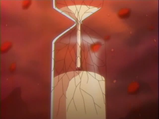 But time is almost up! Another vortex appears overhead and begins sucking things up. (Again starting with Kon.) Ichigo powers up for ban kai again only to once again fizzle out before it starts. And just before Chad learns how to breath sand... the glass breaks and the vortex disappears.