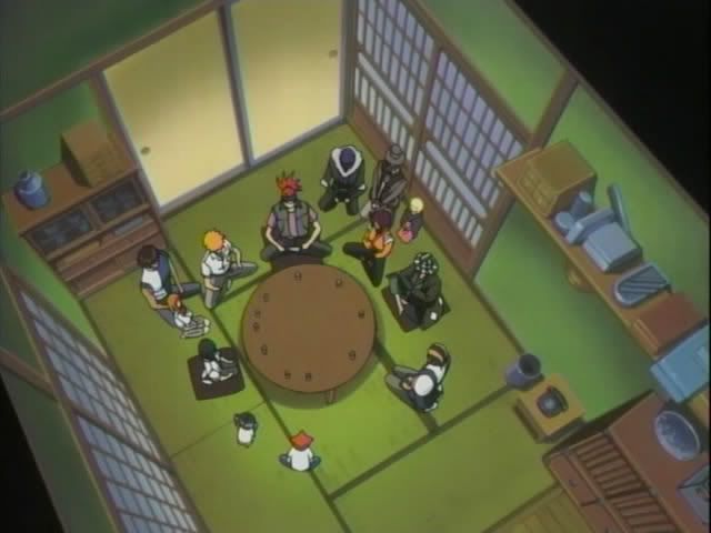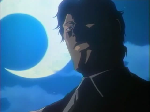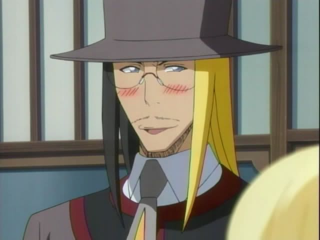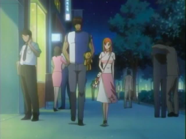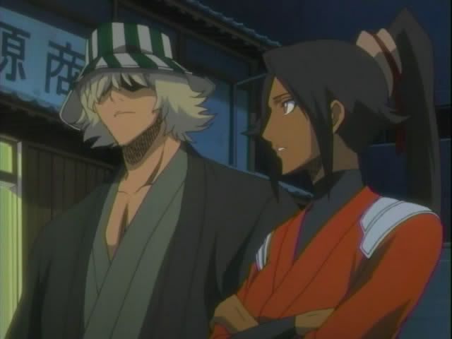 Our merry group heads upstairs for tea. (I am loving this whole human!Yoruichi/Urahara interaction. Oh! Someone finally gave Renji some new clothes.) Urahara gives everyone the low-down (complete with random shot of Captain Urahara) The new enemy is called the Baunt. It seems that the Baunt are sorta like vampires. They feed off souls. The Baunt could live forever if it kept devouring souls (The Quincy were included in the explanation but I have no freaking clue why) but now the Baunt are taking souls from living humans. (Ichigo gets uppity during it all and Yoruichi and Urahara give him a double look.) Urahara then decides to assign The Mod Squad as a support team. Ririn will go with Ichigo. Claude will go with Orihime. And Nova will go with Chad. (I love Nova!) Ishida gets nothing except for moral support from Ichigo. After the assignments are handed out Urahara and Yoruichi seem them out. (Okay... so I just wanted to throw in another Urahara/Yoruichi cap.)
