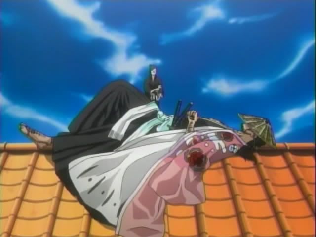 Meanwhile Soi Fong and Yoruichi are investigating some strange happens. The two find a body that's been turned to sand. Soi Fong takes a sample from the glowing spot on the shoulder.