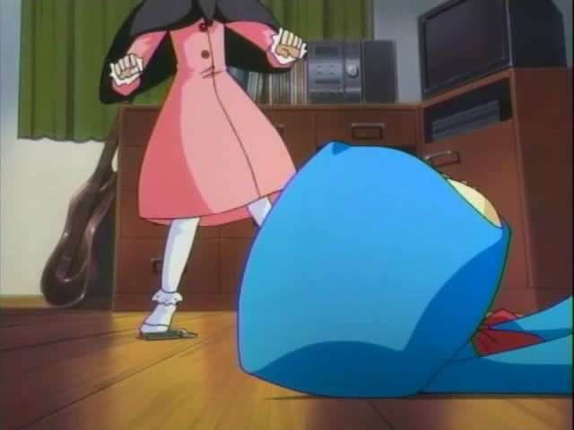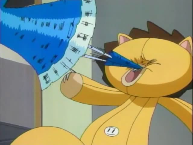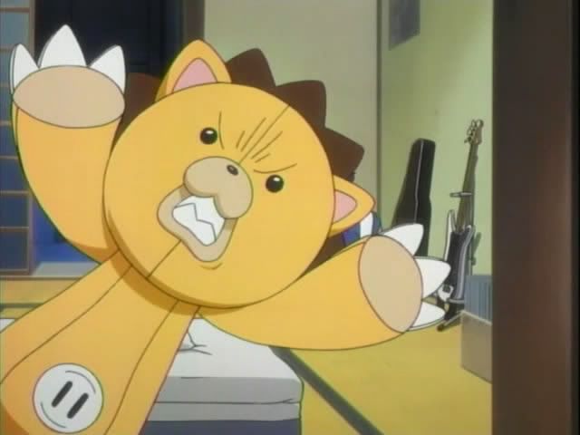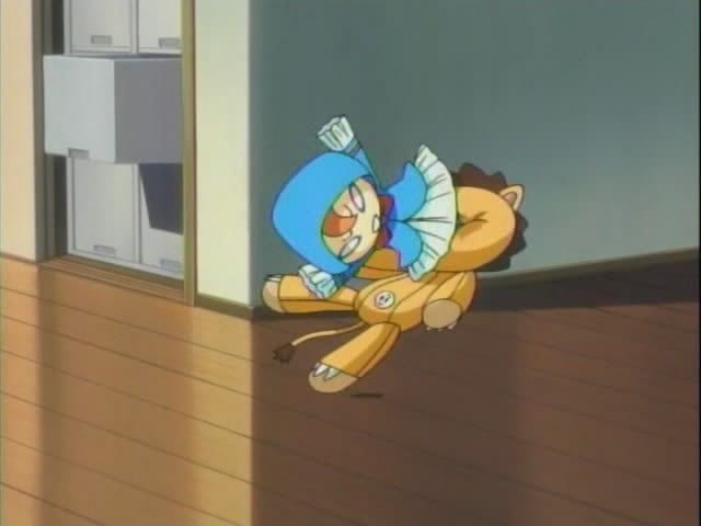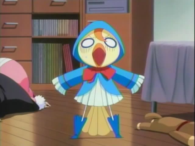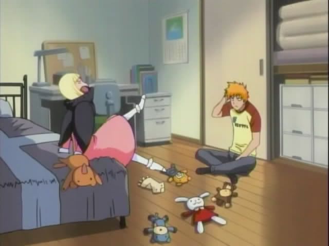 It seems that Ririn is a bit picky and the latest pain in Ichigo's rear end. Ichigo is searching through all of their old stuffed animals, but Ririn is not happy with any of them. Ichigo digs through more plush while Ririn paces and talks the entire time behind him. Finally Ichigo tosses a stuffed bird at her. She stumbles back and steps on Ichigo's badge. She pops free of her body and lands in the bird to her horror. Ichigo gapes as she fumes. Kon shows up to laugh at her and gets drilled in the face. (That's plushie on plushie crime!) Has Kon been replaced as the resident pain in Ichigo's rear?