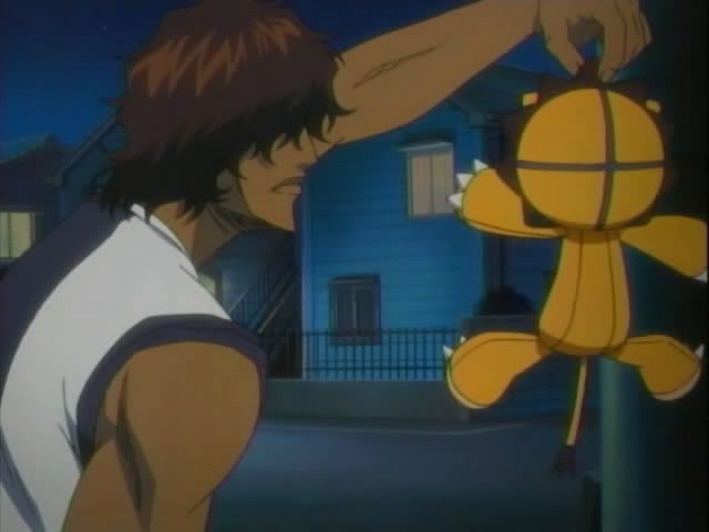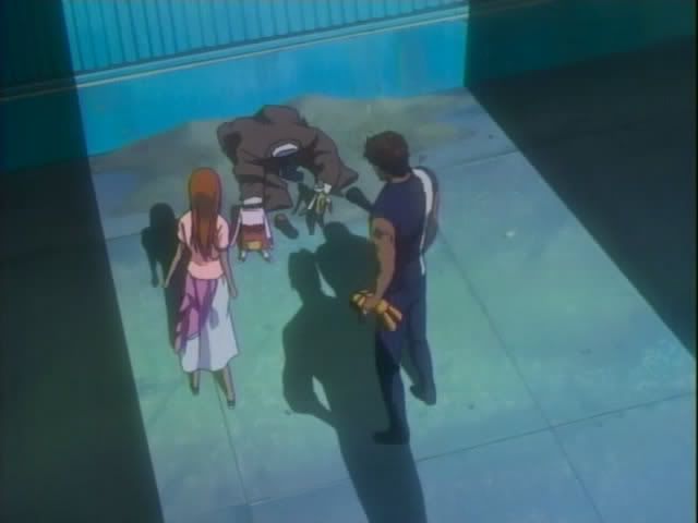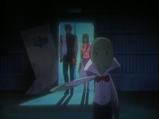 Chad & Co. have ended up in a warehouse district (looks kinda like the place where they trained with Yoruichi.) Nova senses something and jumps down to look for it. Nova found a victim. They watch as the man's body turns to sand. A shadow appears in the doorway and a male Baunt makes an appearance. He spends some time talking and leaves without doing anything to Chad or Orihime. (He also got a couple of looks of plushie anger.) Nova takes one last inspection of the sand.