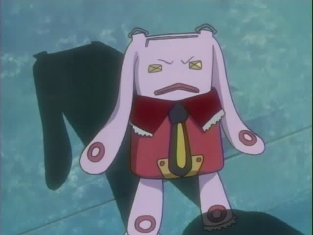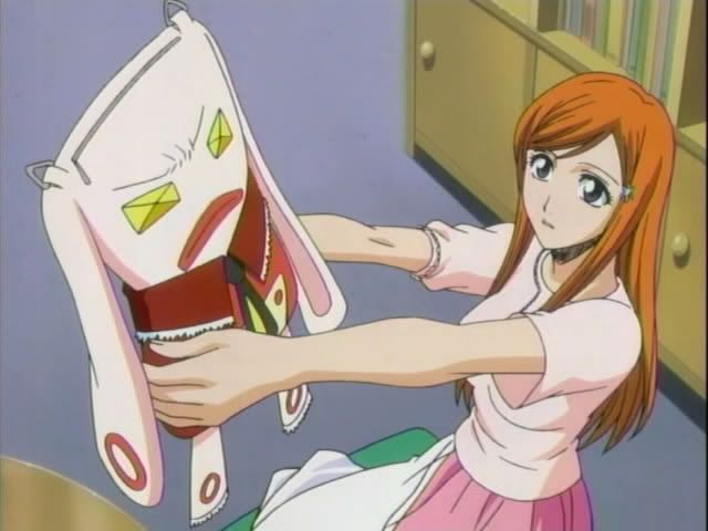 Kon heads to Orihime's place and after hearing an excited noise his imagination runs wild. (And all I can say is WTF, Kon, WTF?) Thankfully Chad is there and tries to stop Kon from barging in, but the plushie gets away. (Nova and Chad are just so cute!) Once inside they find that Orihime's joy is from seeing Claude in his new body... a very odd rabbit.