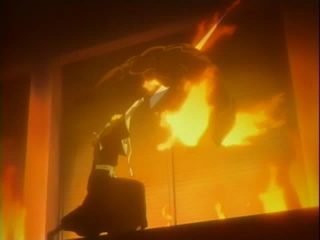 Back at the fight Ichigo is learning that his hack and slash technique ain't working. No matter how many times he cuts through it the doll keeps putting itself back together. Ichigo looks for a weak point. He goes for the "heart". The doll begins to fall apart, but it just keeps shooting things at Ichigo. (I think it shot the pieces of it's "body" at him.) It throws Ichigo and Ririn back against a wall and the doll uses the opening to put itself back together. It powers up two fireballs as Ririn checks on Ichigo. Ichigo is up but stuck. The doll launches two huge fireballs directly at Ichigo and Ririn. They freak out. But before Ichigo gets roasted a lightening strike blasts the fireballs. When the smoke clears there's a familiar figure standing in the middle, Rukia (and I believe she's wearing the dress Ishida made for her.)