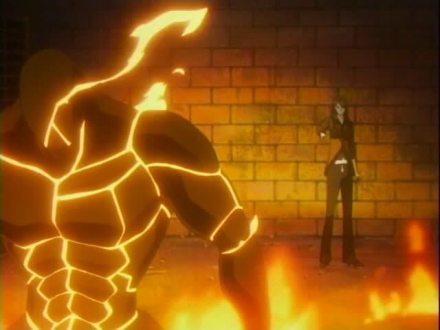Ichigo and Ririn chase the woman down an alley and corner her against a wall. But she summons a "Doll" which is a large, fiery humanoid beast. Ichigo dodges the fireballs it flings and attempts to chop it's arm off, but the arm easily reattaches.