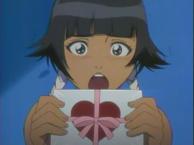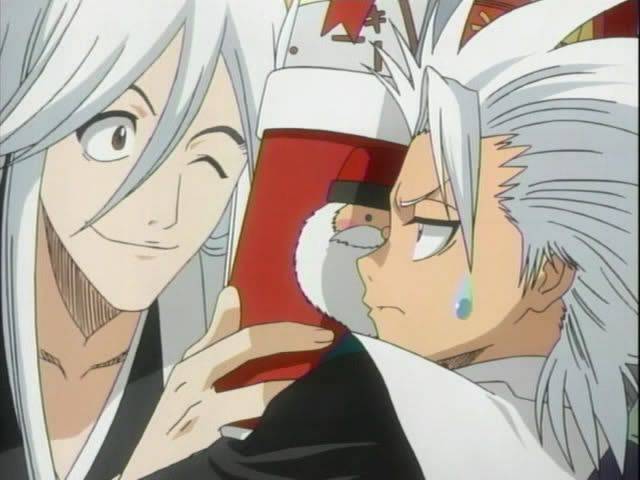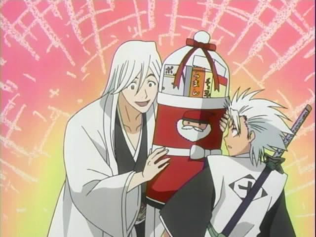 Then after a short promo break where Kon and Ririn gives some details about a contest... we get another Shinigami guide. This one finds Ukitake and Hitsugaya in another serious talk. Then Ukitake busts out this and tries to force it on the poor boy. Then Ukitake breaks out the creepy uncle face. (Why anime people? Why? It was funny last week... this week... not so much.)